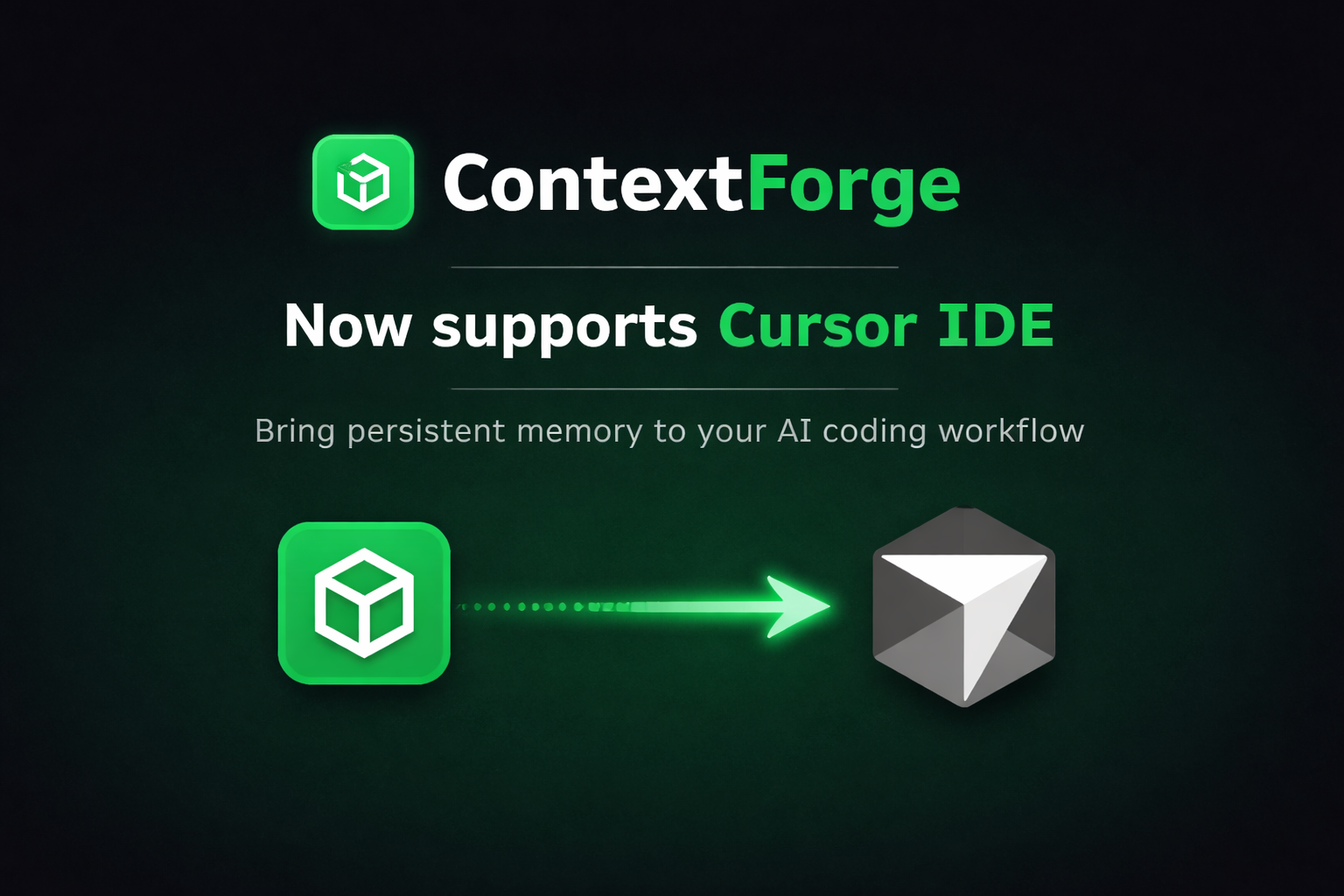 If you've ever wished your AI coding assistant could remember things between sessions — project decisions, API patterns, debugging insights — ContextForge already solved that for Claude Desktop and Claude Code users. Today, we're excited to announce that ContextForge now officially supports Cursor IDE.